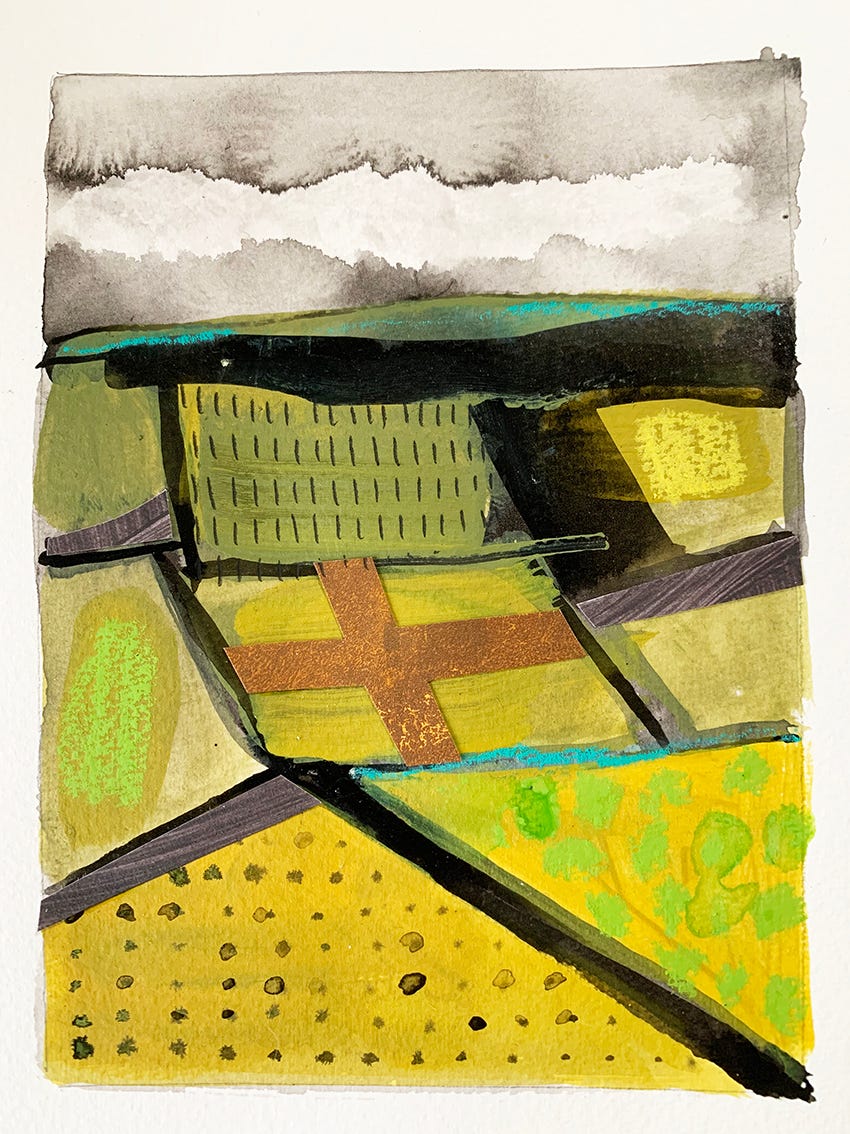 This week I have been playing with that imagery, the sense of space and place. In spite of life having felt heavy and ‘up hill’ I found time to create and process the experience of that sunny day in nature. If it’s bright all the time, if your energy is high all the time, if there is no light and shade, no seasons that change, perhaps it is harder to stop and notice and be in awe.